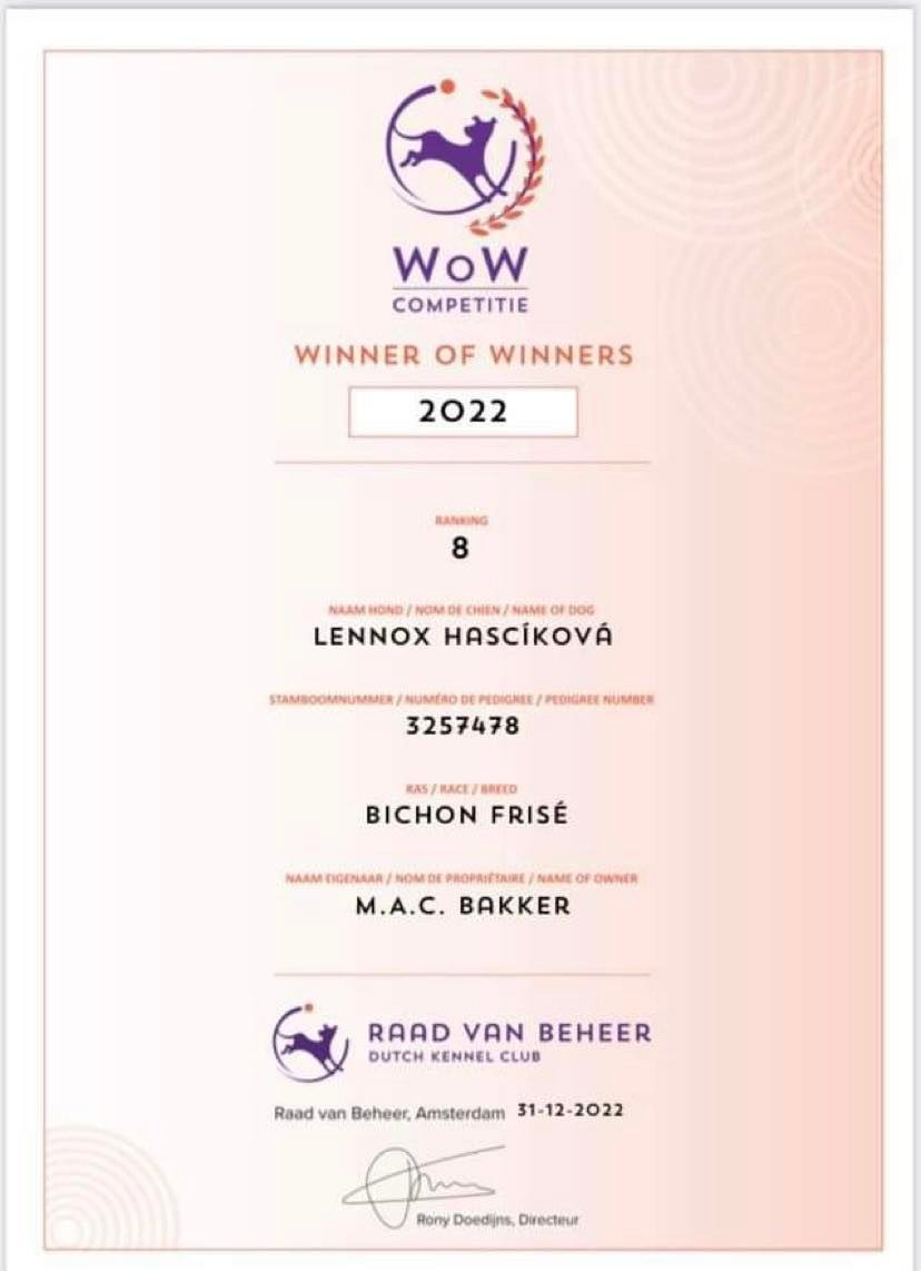 | 4 maart 2023 Lennox 8e geplaatst in de WoW competitie, helaas is het met Lennox allemaal anders gelopen, maar geniet hij nu als huishond bij Marcel en Ingrid. |
